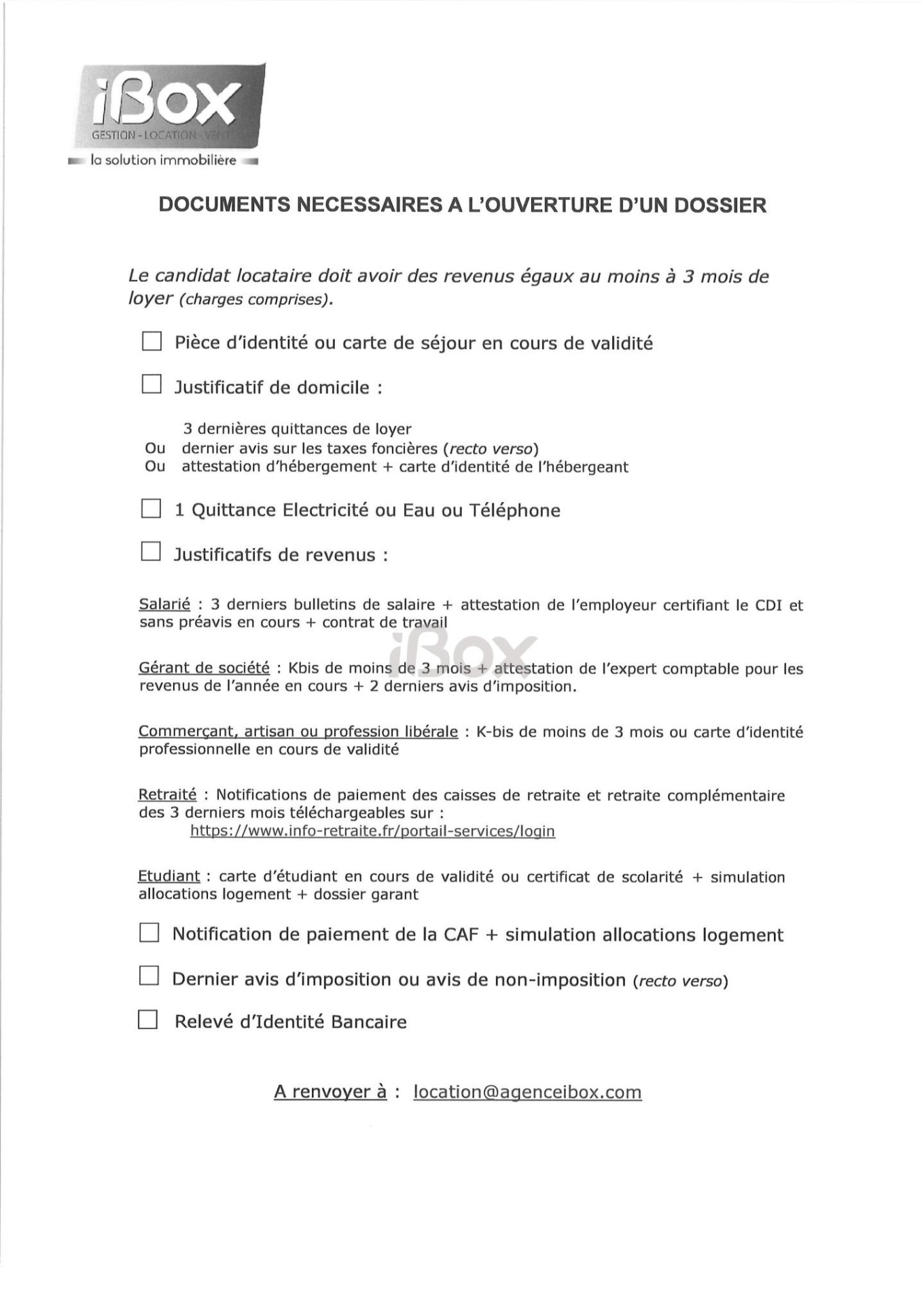 Dossier complet à envoyer à l'agence avant toute visite.