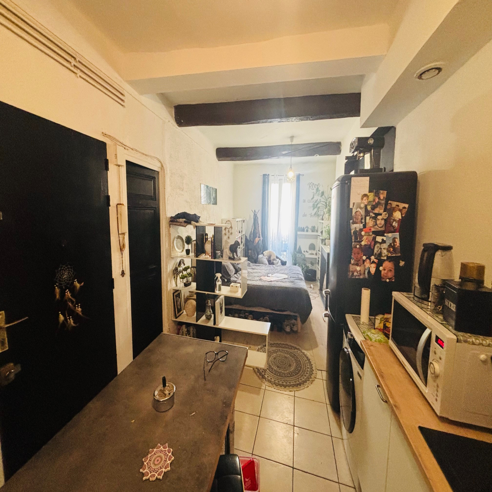 Entrée sur espace à vivre avec cuisine US aménagée équipée, petite chambre avec salle d'eau, WC indépendants.