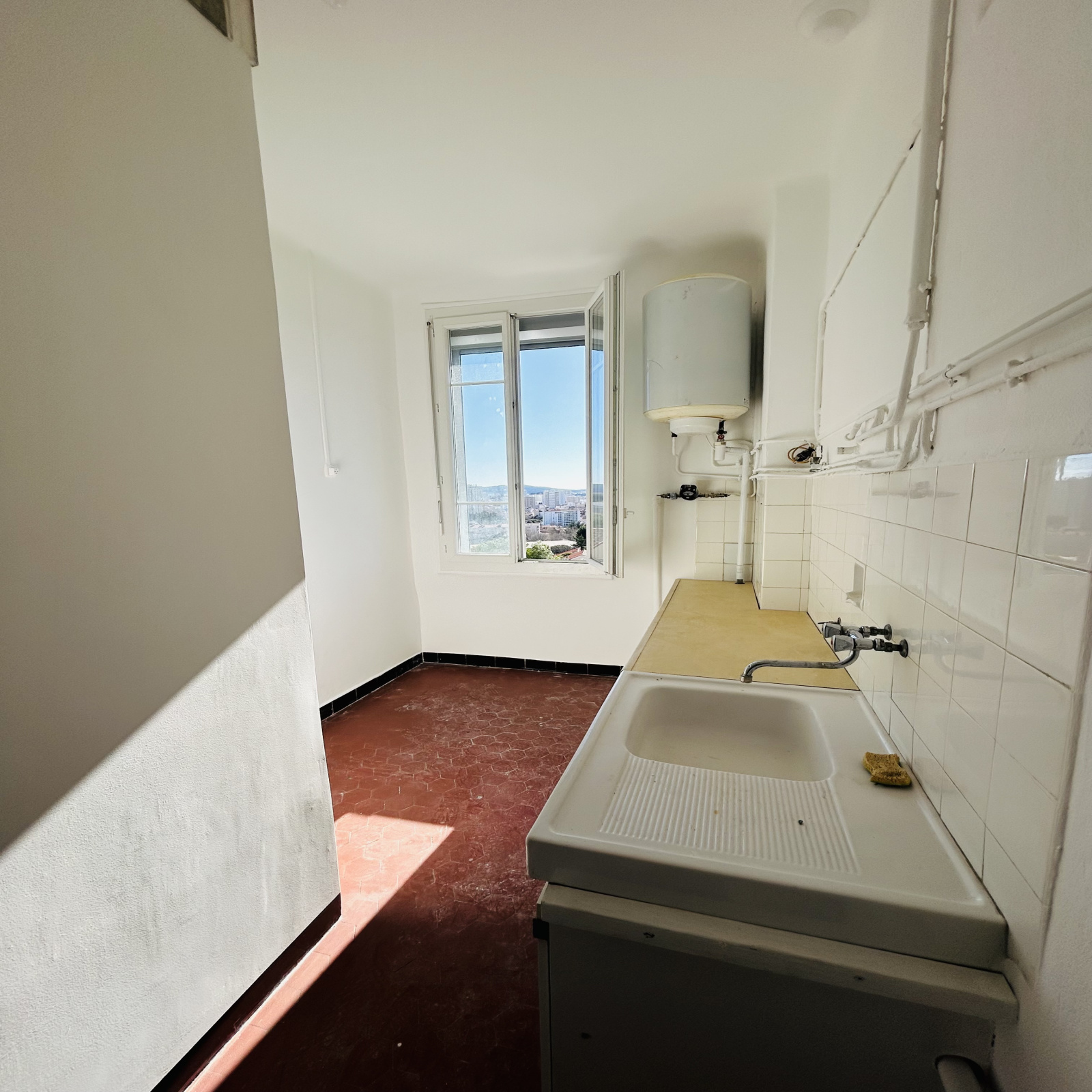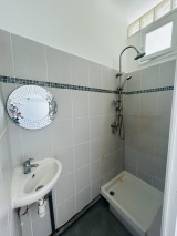 Entrée desservant un bel espace à vivre avec balconnet plein sud vue mer, cuisine indépendante à équiper, salle d'eau, WC indépendant.