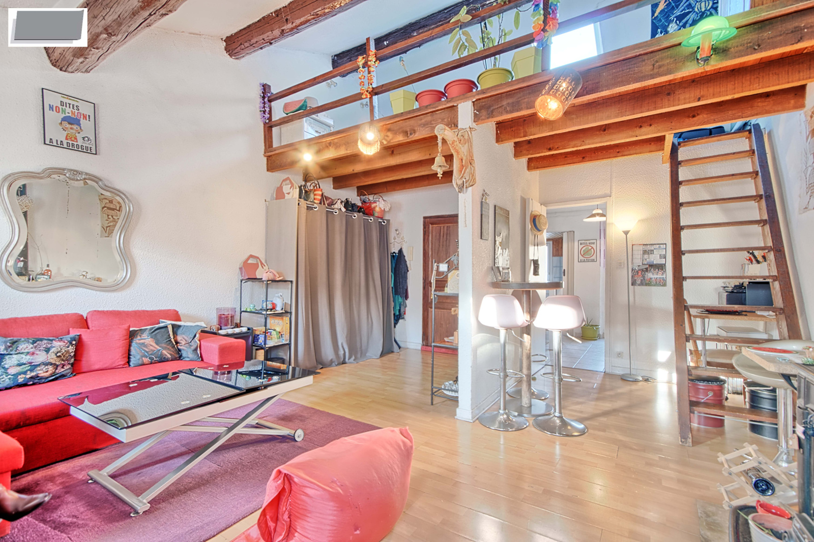 Appartement, traversant EST/OUEST, de Type 2 de 54m² en duplex (37m² Loi Carrez), situé en deuxième et dernier étage, composé d'un hall d'entrée desservant une pièce de vie de 25m², un coin nuit en mezzanine de 15m² avec rangements, cuisine séparée et équipée donnant sur balcon avec vue dégagée, une salle de bains et wc.