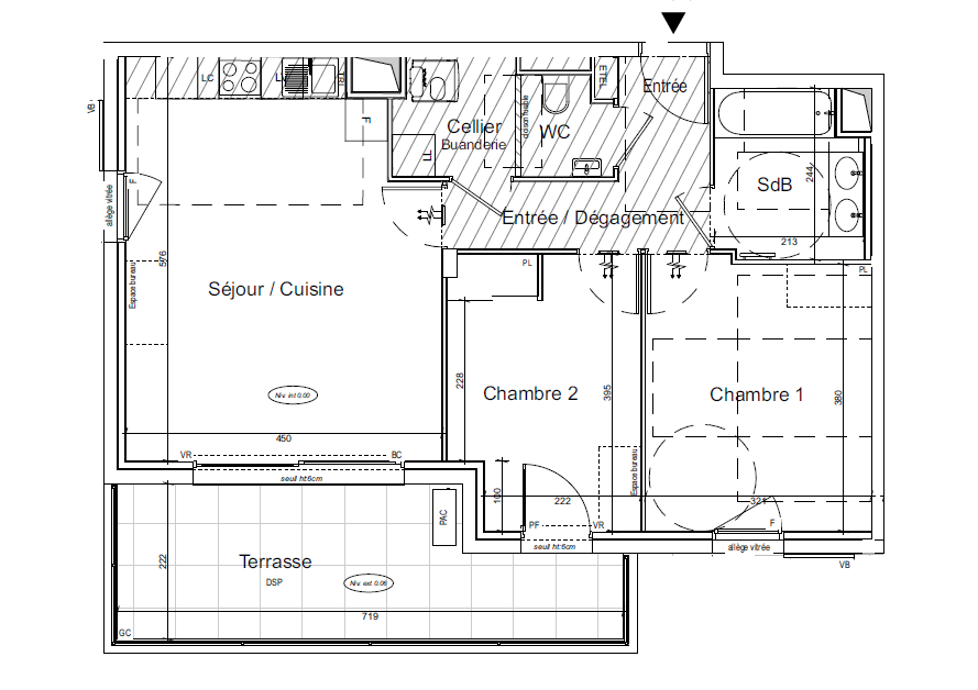 Un appartement T3 situé au premier étage du bâtiment C d'environ 62m² comprenant ; un salon/séjour, 2 chambres, une salle de bains, dégagement, WC séparés, une terrasse.