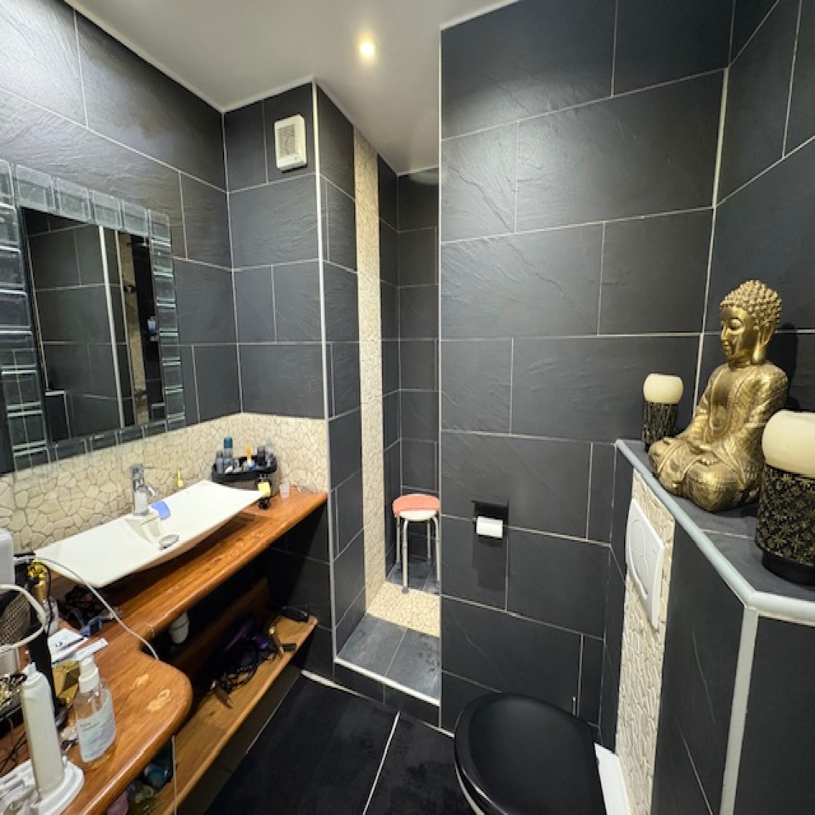 Une chambre et une salle d'eau avec wc.