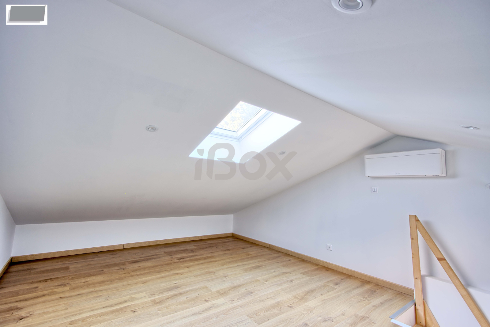 À l’étage, une pièce sous combles pouvant servir de bureau et une petite mezzanine de rangement.
