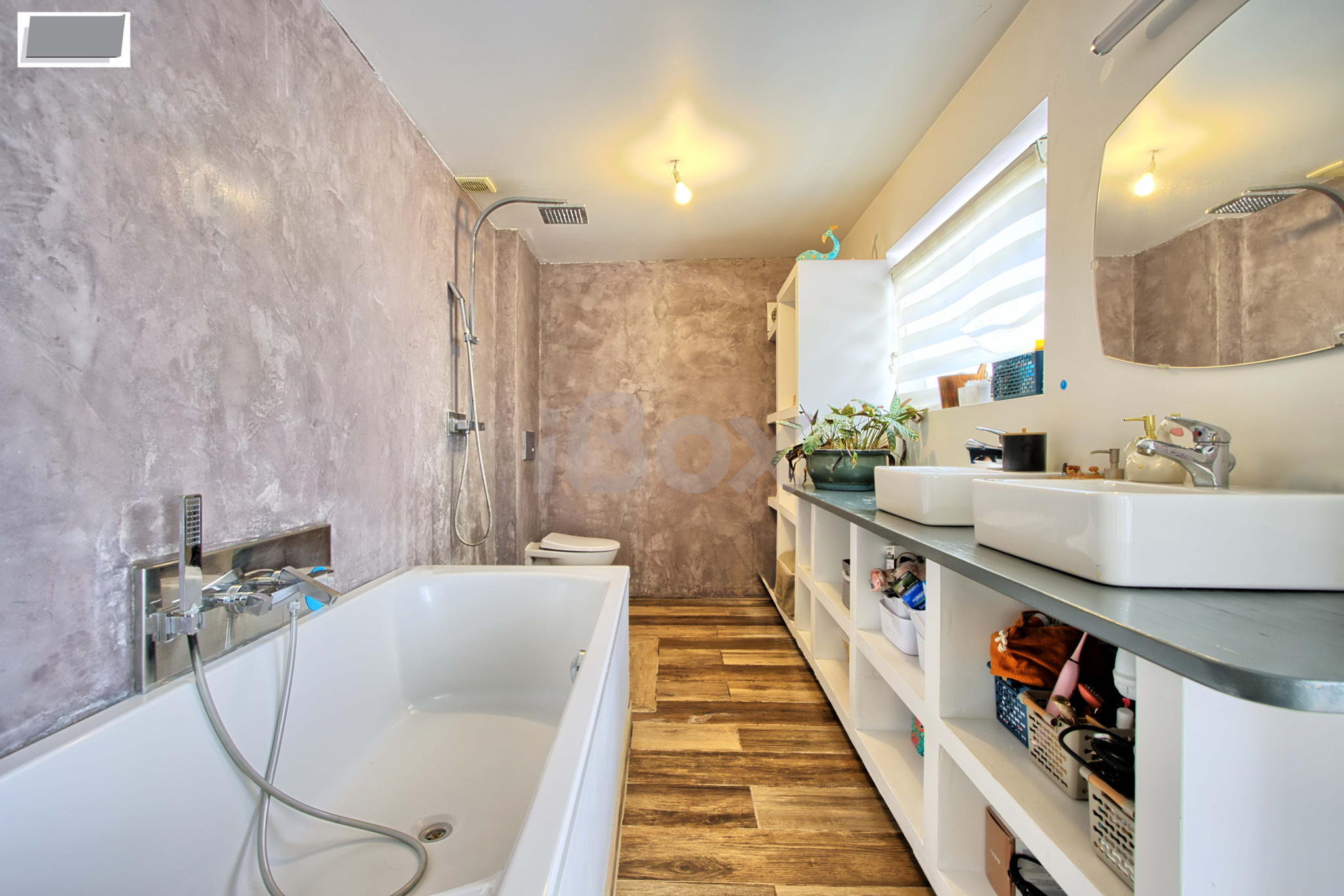 Hall d'entrée, salon, salle à manger (possibilité troisième chambre) ouvrant sur terrasse de 20m2, cuisine ouverte, une chambre, grande salle de bains avec douche baignoire et wc.