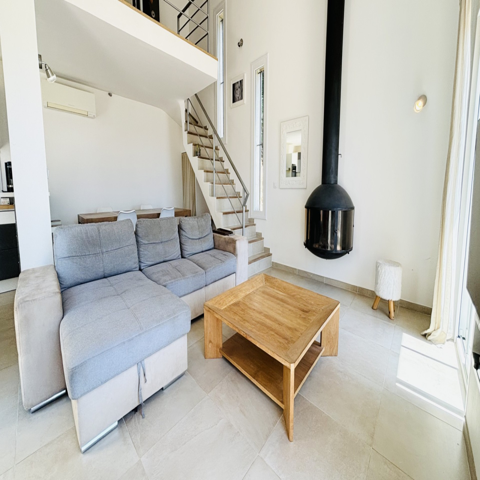A l'étage, mezzanine plongeant sur séjour pour coin bureau, 4 chambres, salle d'eau, WC indépendant.