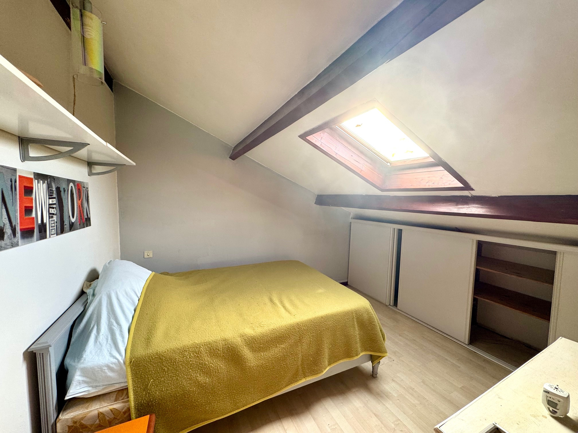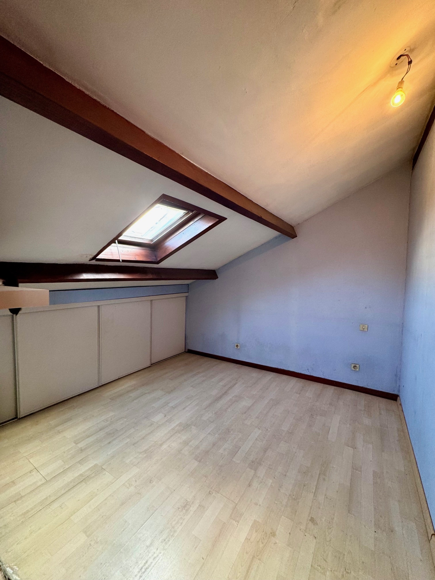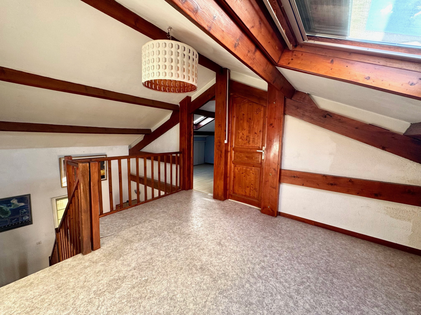 À l’étage, deux chambres supplémentaires mansardées s’accompagnent d’un coin bureau parfait pour le télétravail ou l’espace enfants.