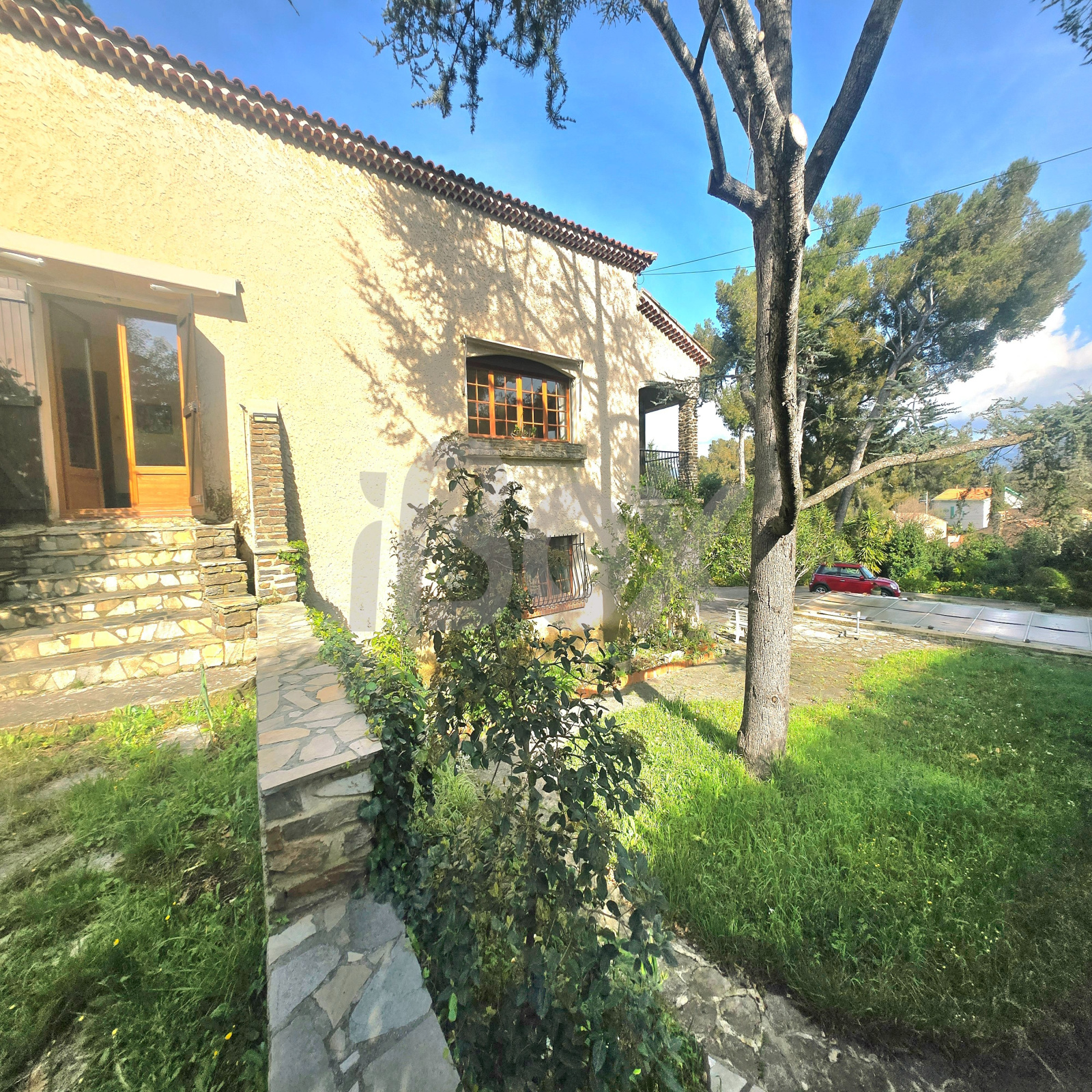 Le terrain, entièrement clos et arboré, accueille une piscine et offre un cadre de vie agréable et verdoyant à seulement quelques minutes à pied de la mer.
