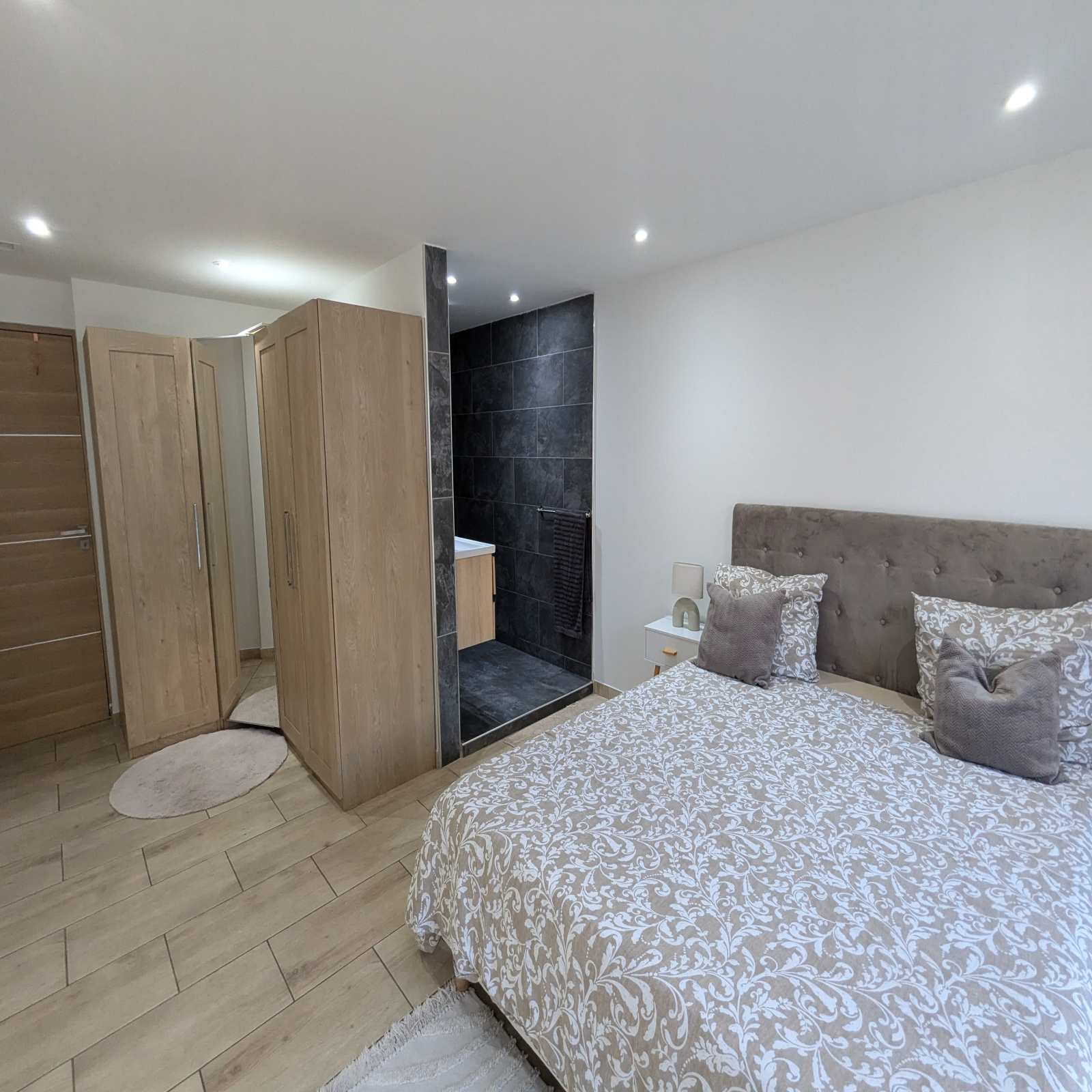 Côté nord, une spacieuse terrasse en bois avec spa offre un espace de détente préservé, à l’abri des regards. Un garage et une cave complètent les prestations en rez-de-jardin.