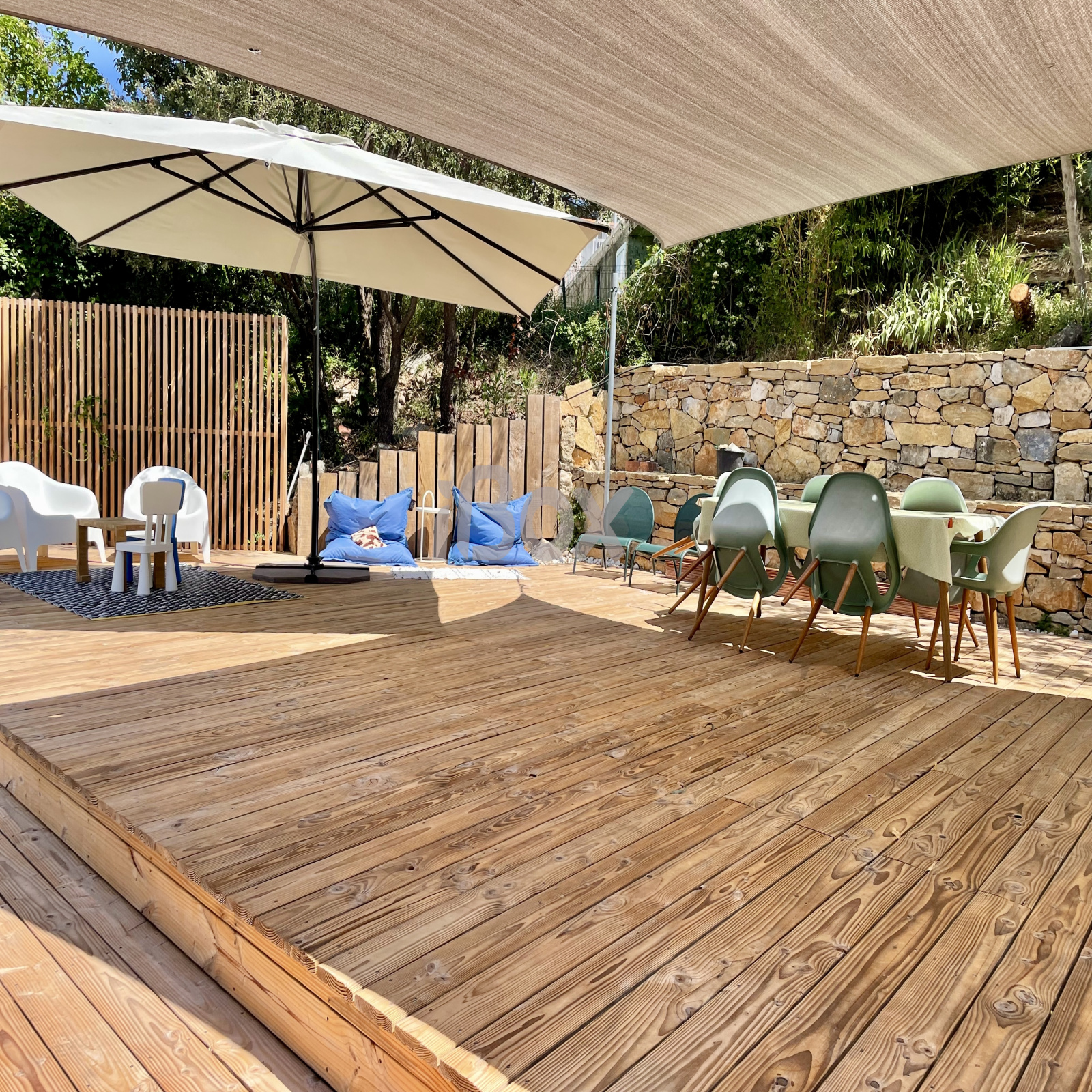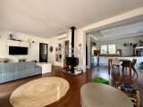 Cette maison est composée au premier niveau d'une belle cuisine ouverte sur un double salon séjour donnant sur une grande terrasse ensoleillée, deux chambres, une salle de bains avec douche et baignoire, et wc séparés.
