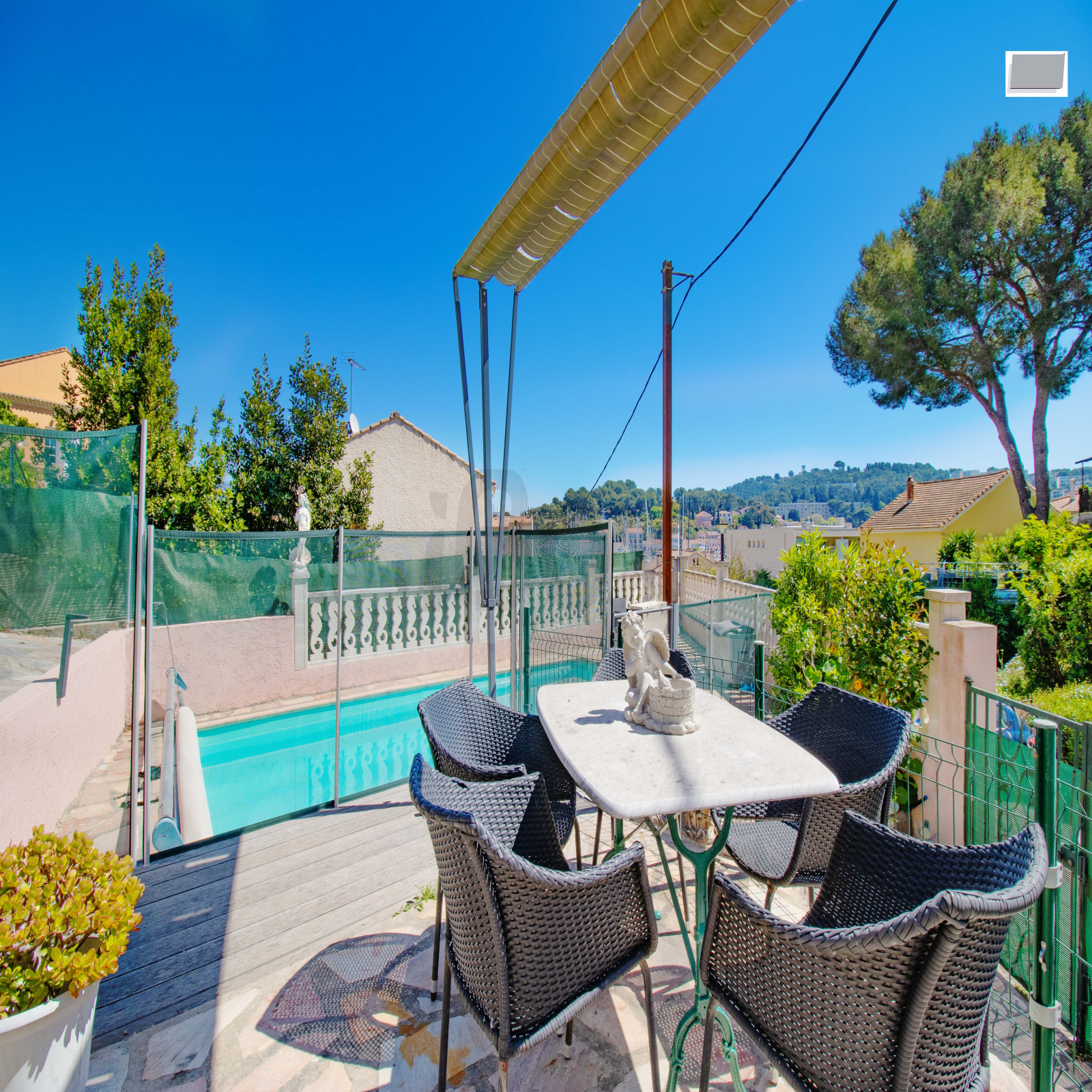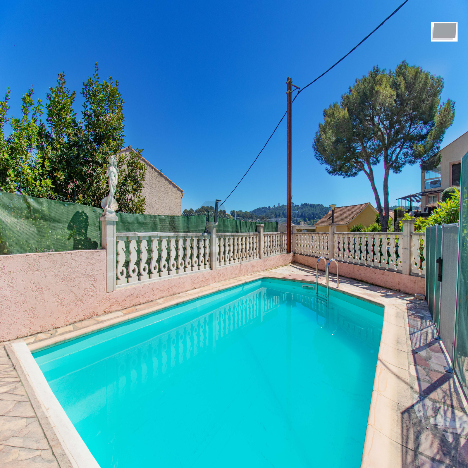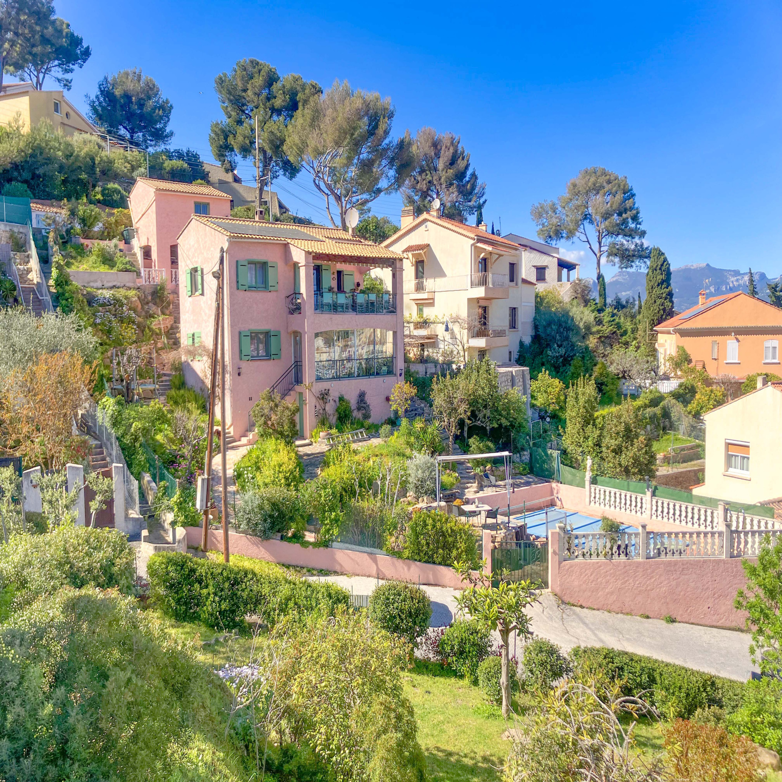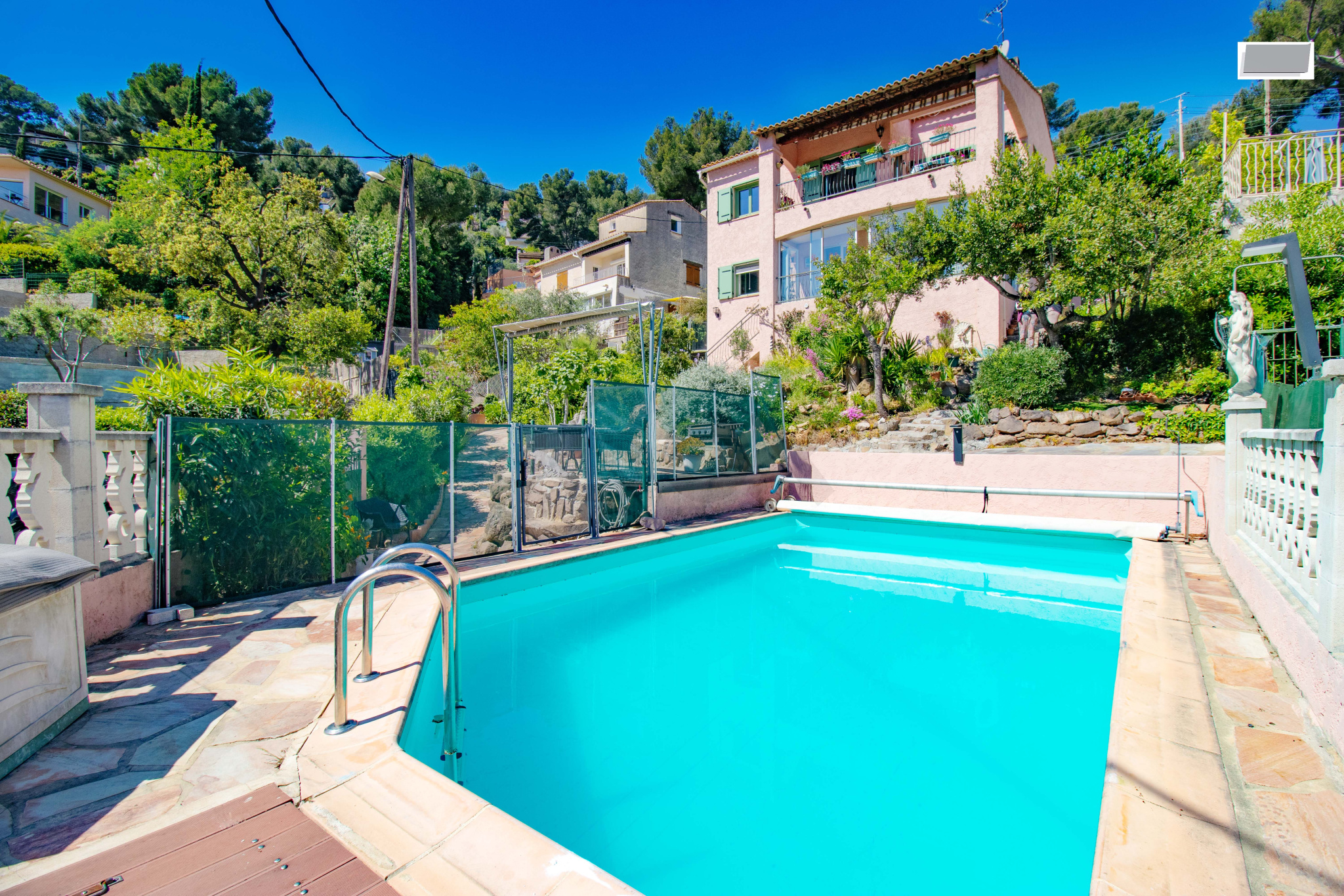 Édifiée sur un terrain d’environ 640 m², la propriété dispose d’un agréable jardin arboré d’environ 500 m², aménagé en restanques, ainsi que d’une belle piscine creusée. Celle-ci est sécurisée par des barrières amovibles en été et une bâche à barres en hiver. Une spacieuse terrasse permet de profiter pleinement du panorama et du cadre environnant.