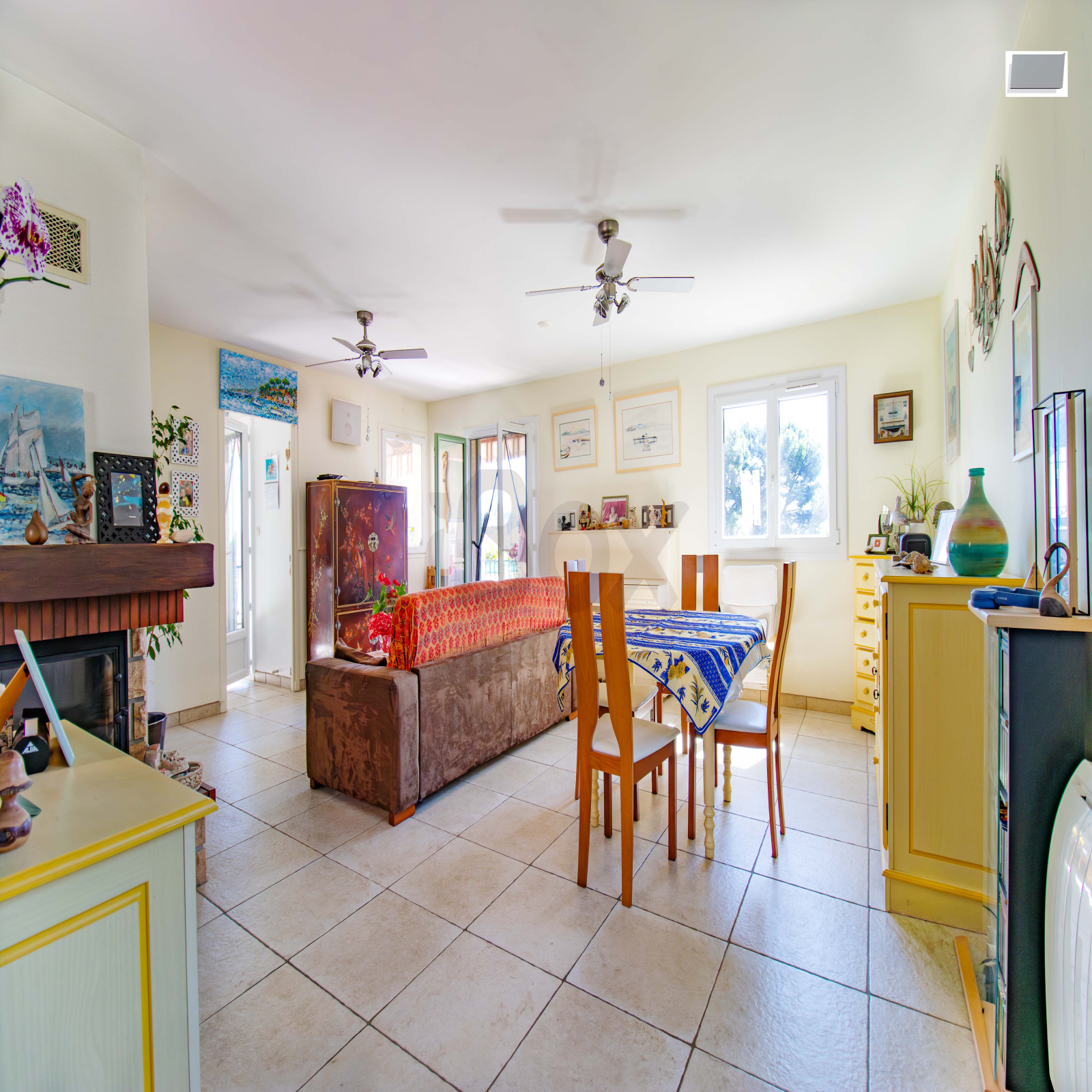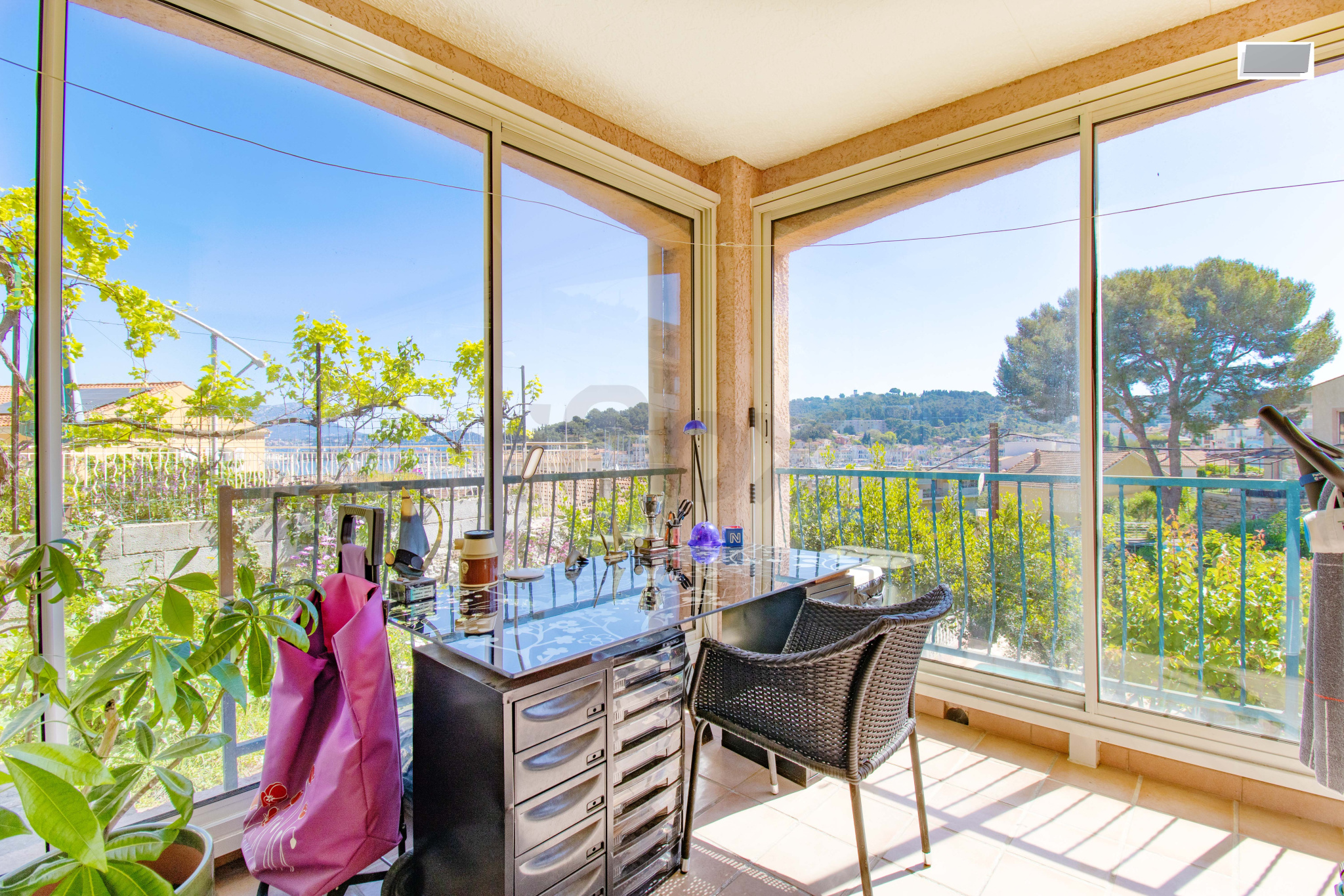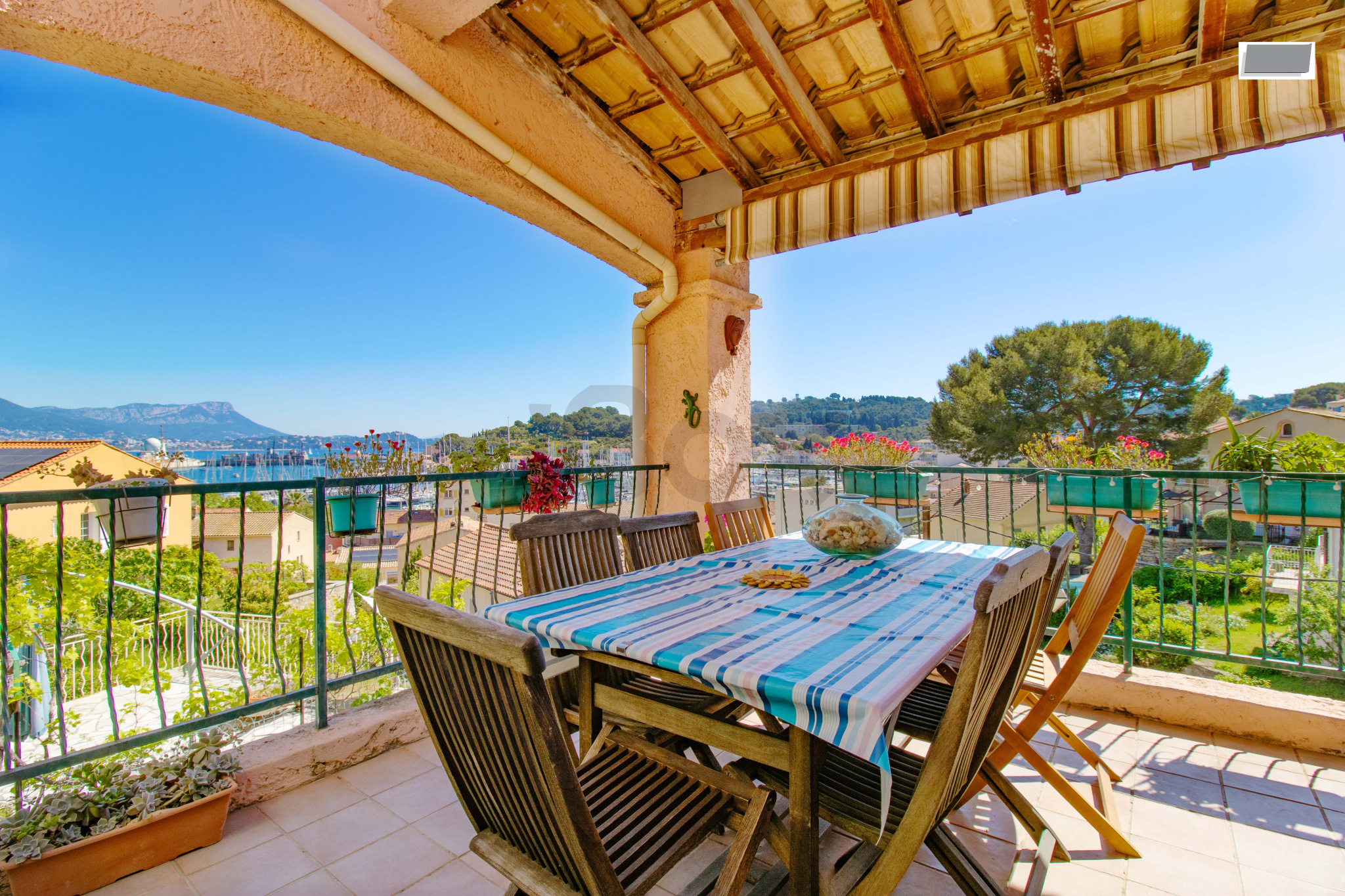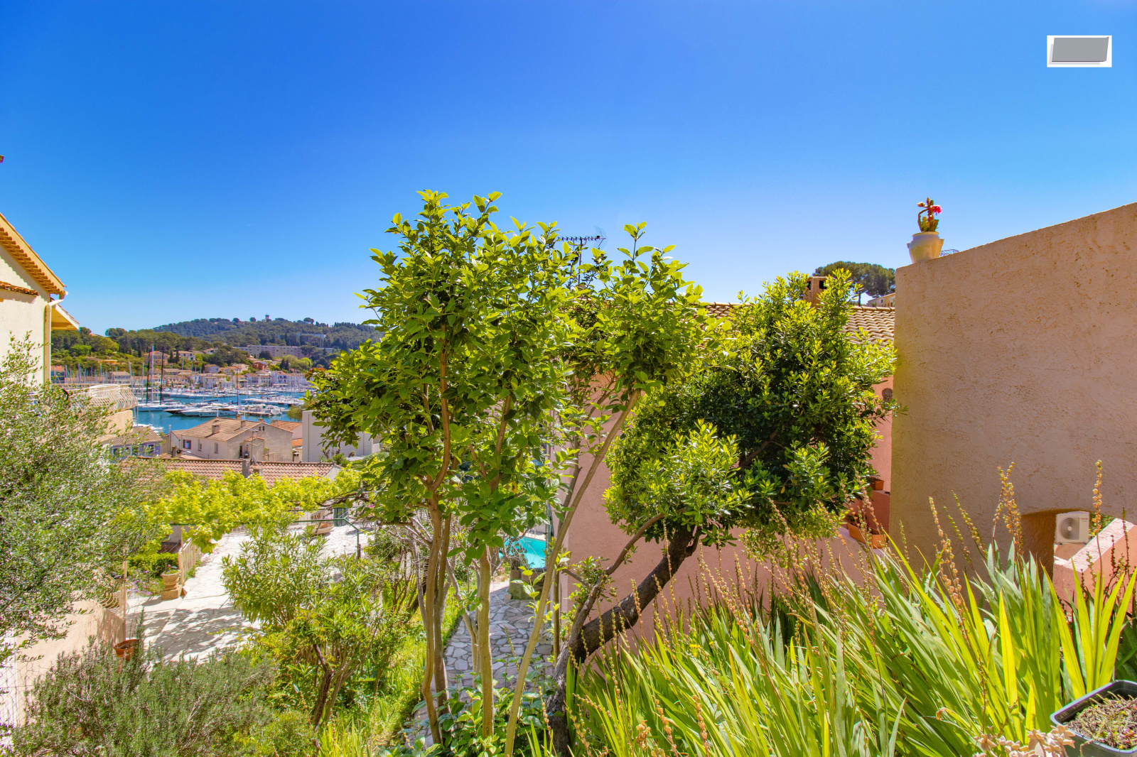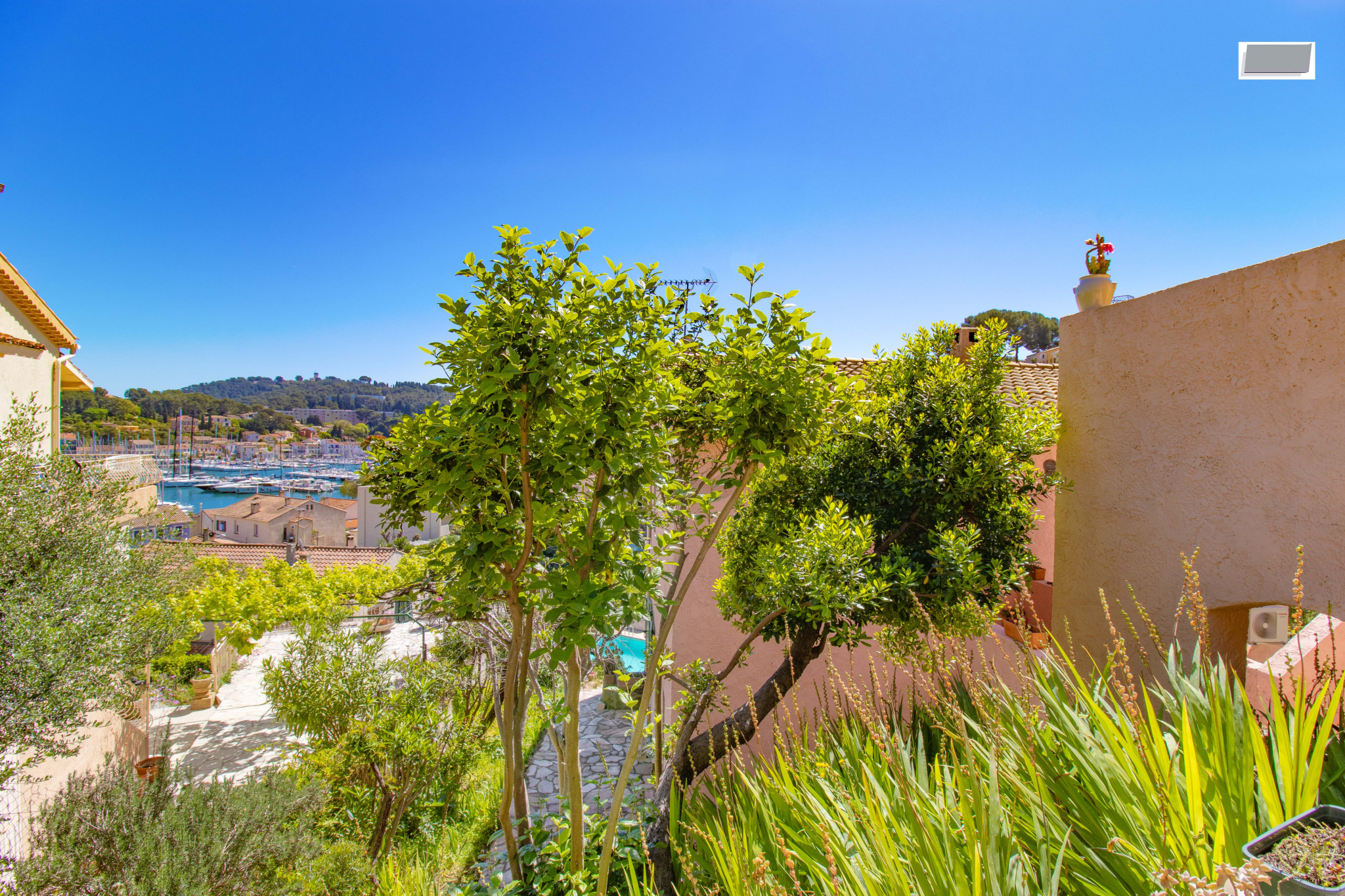 La villa est idéalement située à seulement 100 mètres à pied du port et de la navette maritime, et bénéficie de deux accès en voiture, un atout rare sur le secteur.