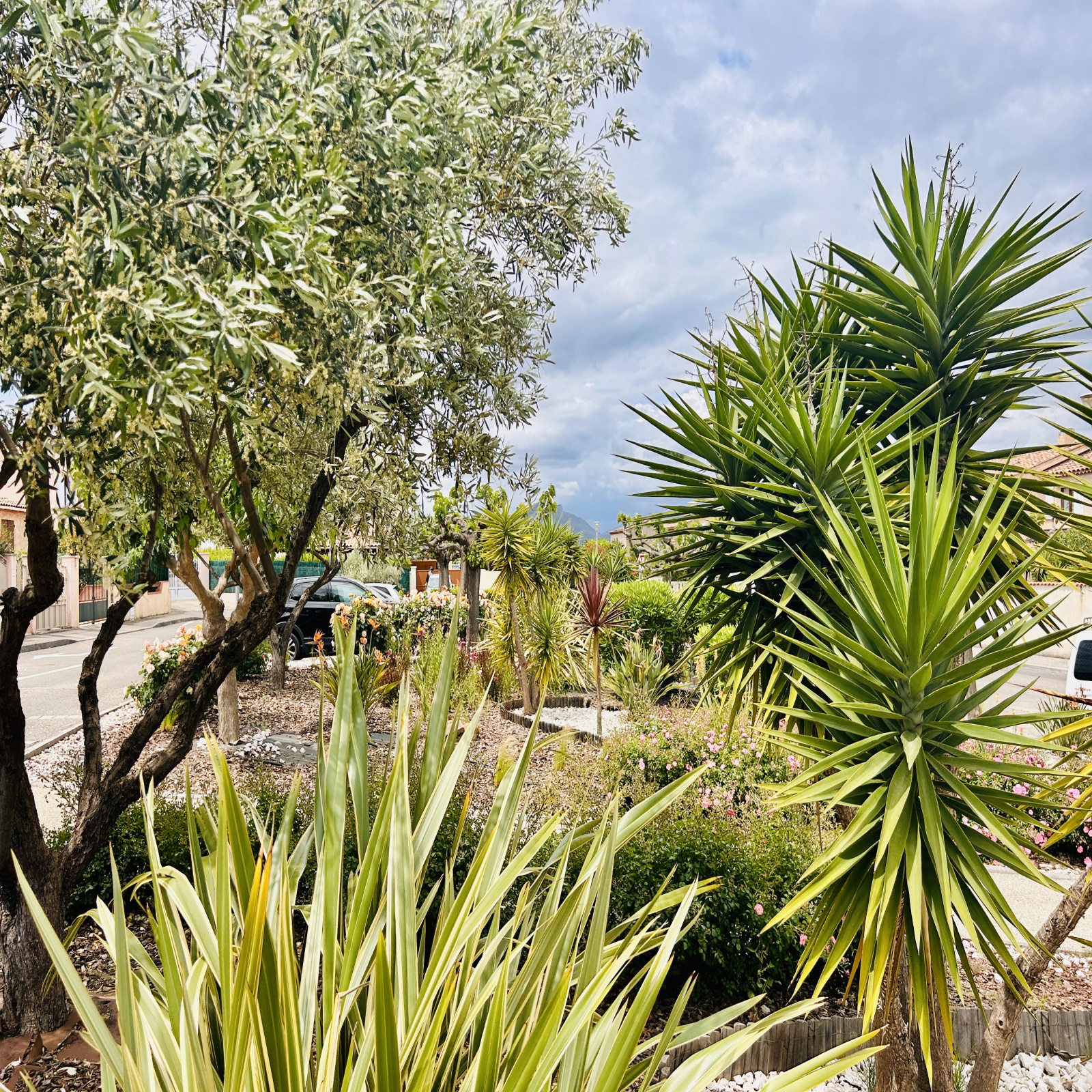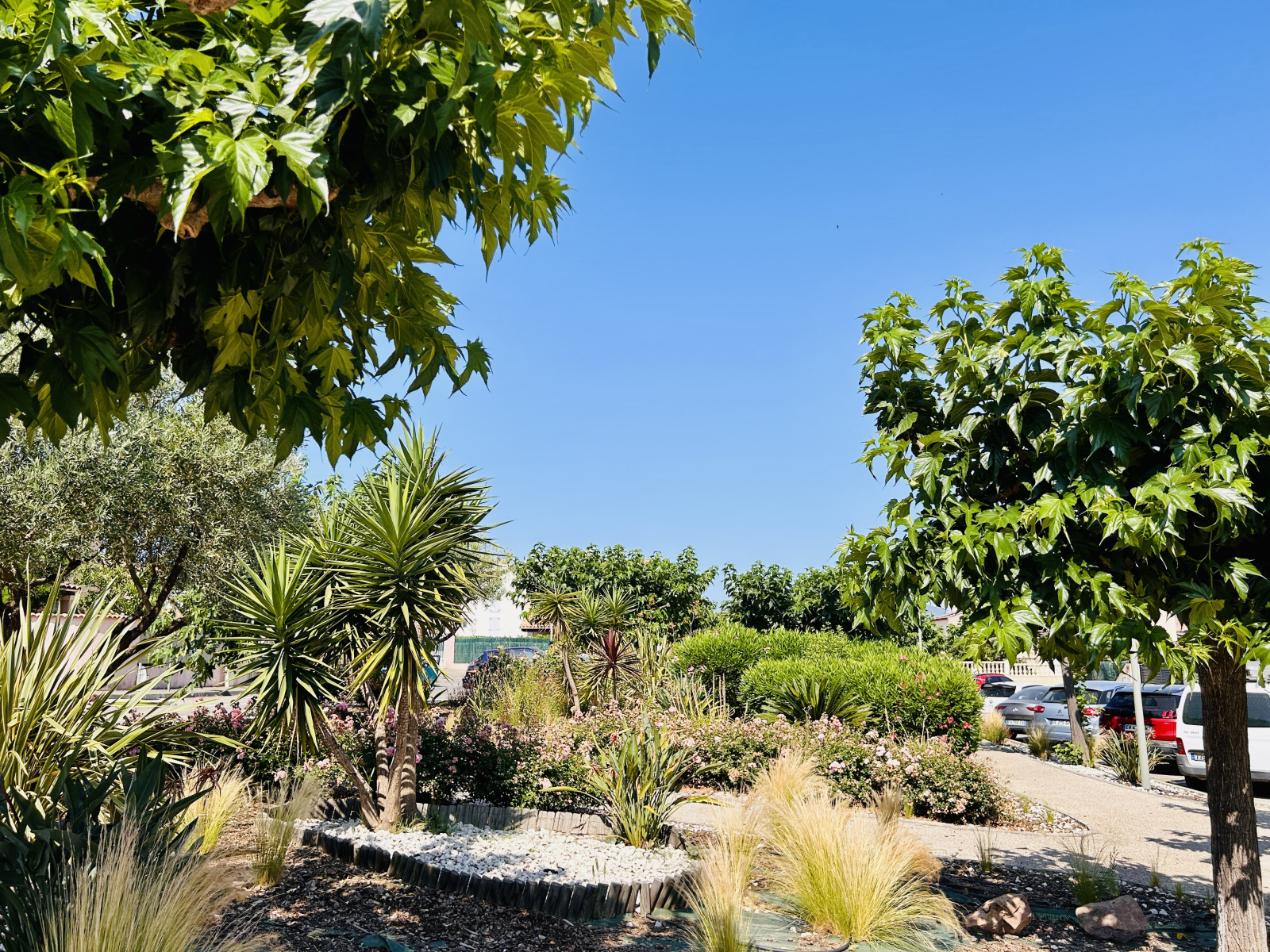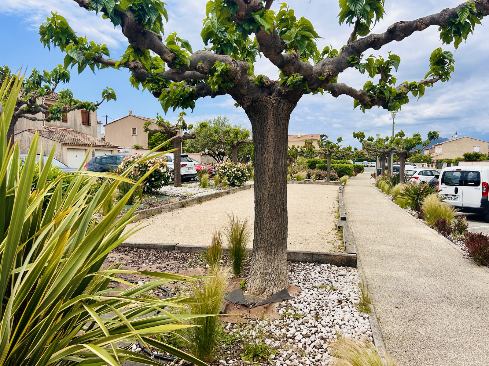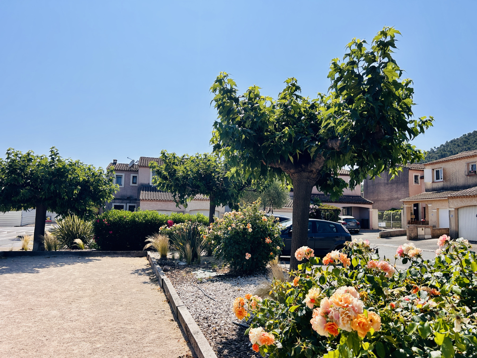 Stationnement possible devant le garage ou sur le parking du lotissement arboré avec terrain de pétanque (sans charges) .