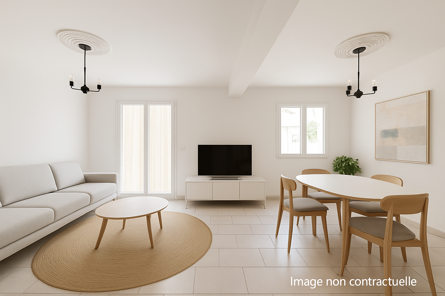 Maison traversante de Type 4 de 76m² composée d'un hall d'entrée desservant un espace de vie avec cuisine équipée de 28m² donnant sur un extérieur exposée au Sud, wc et accès au garage avec coin buanderie.