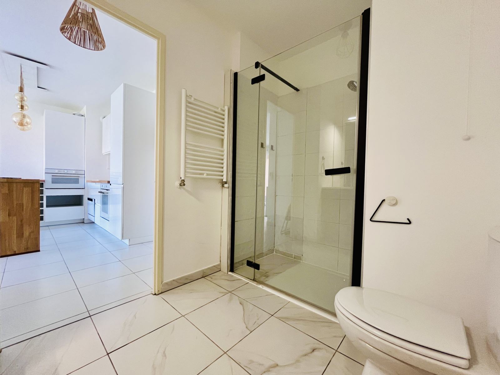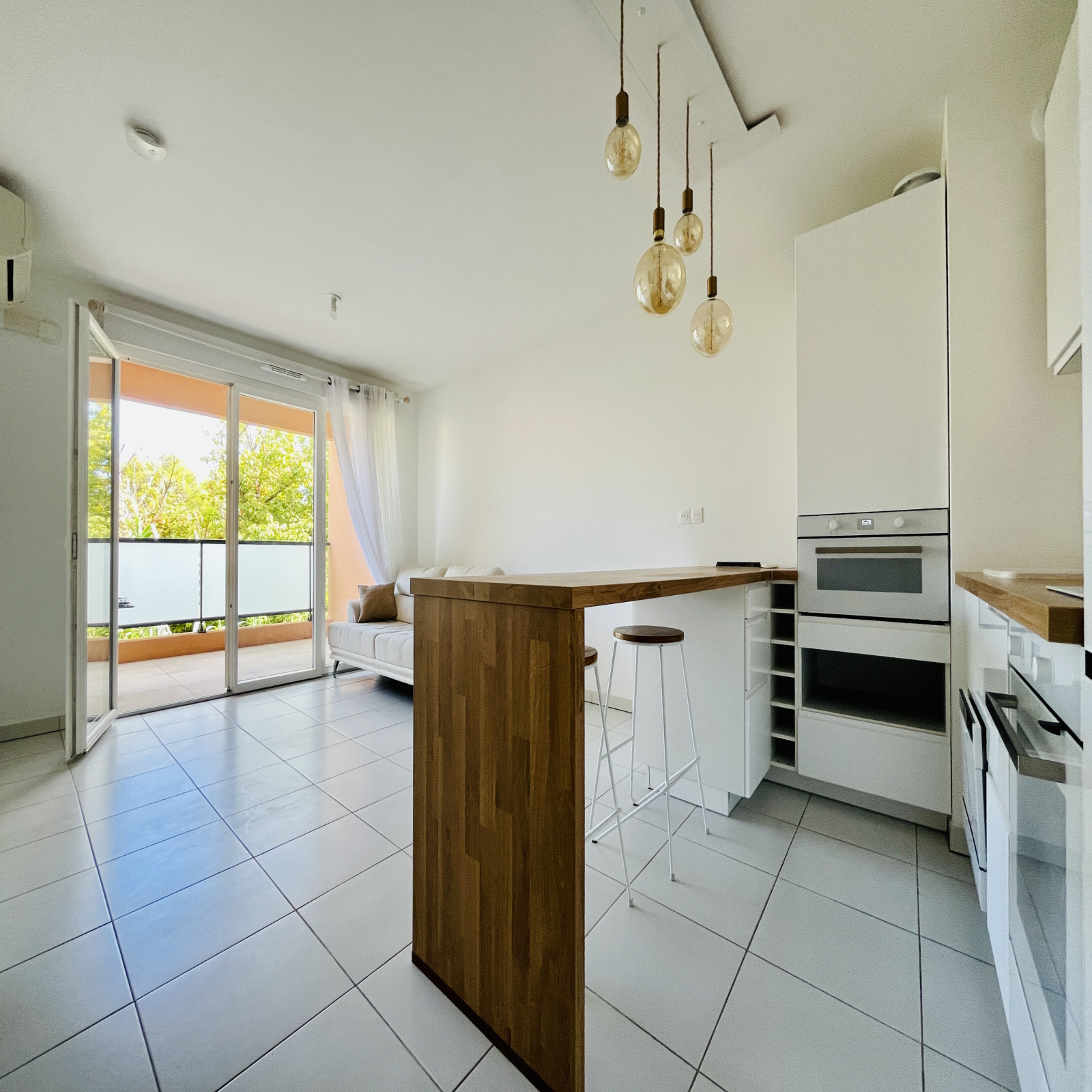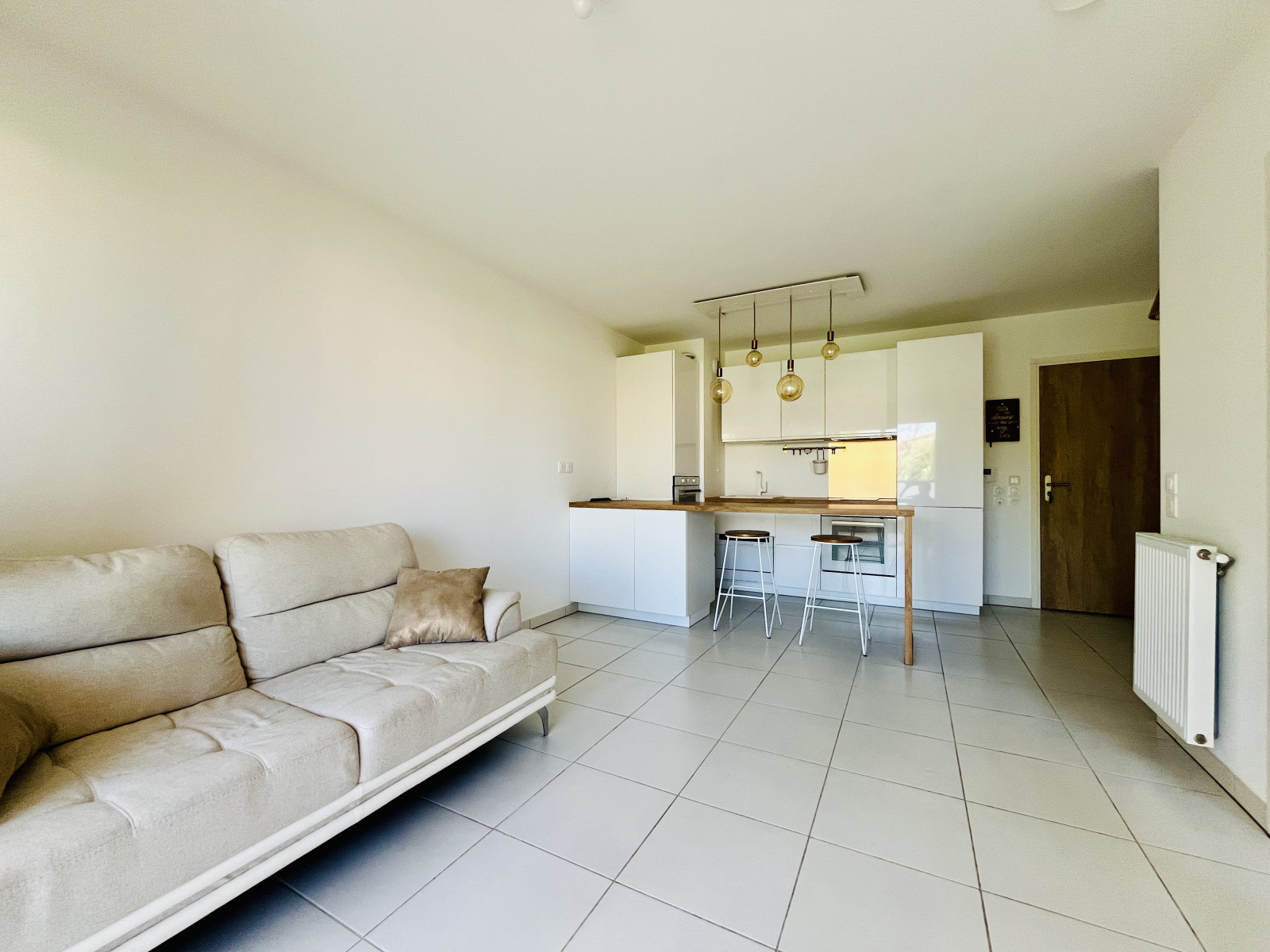 Entrée sur séjour cusine intégralement équipée ( frigo, four, micro-onde, lave-vaisselle encastrable) et aménagée.